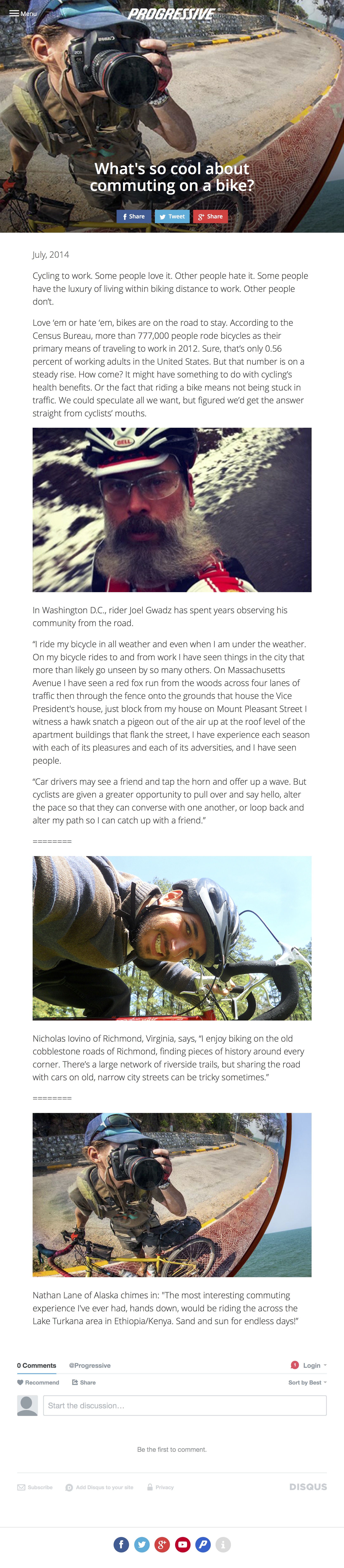 cycling selfies at.progressive.com/apron-projects – july 2014 *click article to enlarge* Share this: Click to share on X (Opens in new window) X Click to share on Facebook (Opens in new window) Facebook Like Loading...